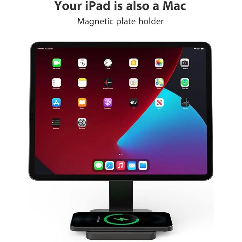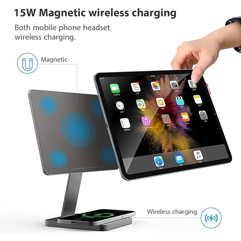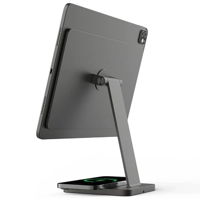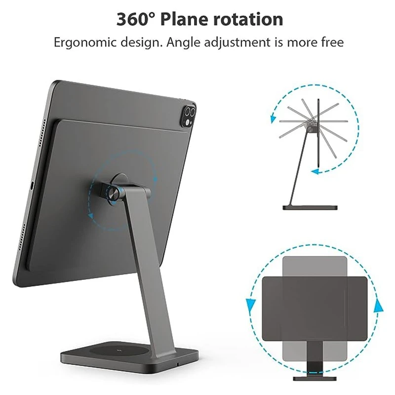 Questo supporto per compressa rotabile a 360 gradi combina una forma elegante con ricarica wireless magnetica rapida da 15 W. Progettato da un produttore professionista OEM/ODM nel Guangdong, in Cina, lo stand è adatto per tablet, smartphone e accessori wireless. Usalo a casa, in ufficio, a contatori POS, showroom o cabine per fiere.