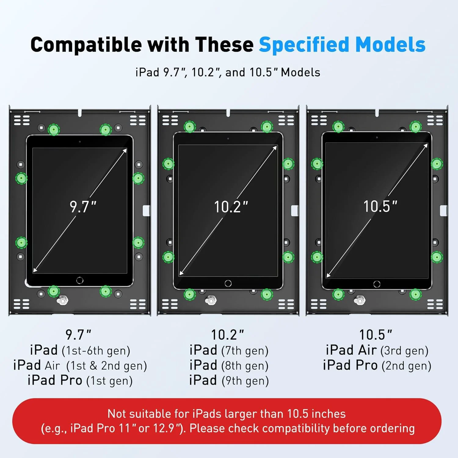 iPad 9.7" (1st–6th gen), iPad Air (1st–2nd gen), iPad Pro 9.7" / iPad 10.2" (7th–9th gen), iPad Air 10.5" (3rd gen), iPad Pro 10.5"