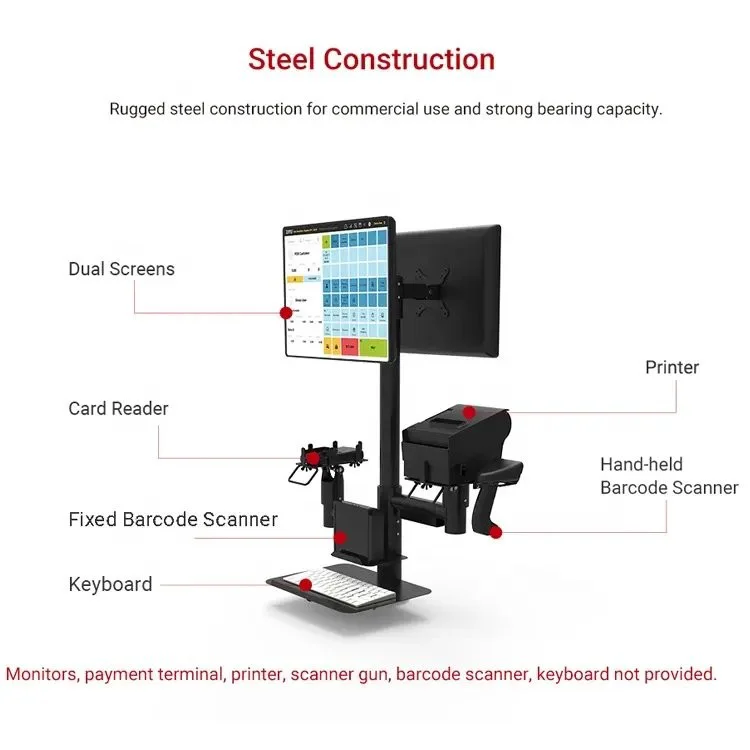The Universal Adjustable POS Terminal Holder Swivel Stand is a heavy-duty metal POS pole mount system designed to securely hold POS terminals, displays, card readers, barcode scanners, and receipt printers in retail, hospitality, and self-service environments.
