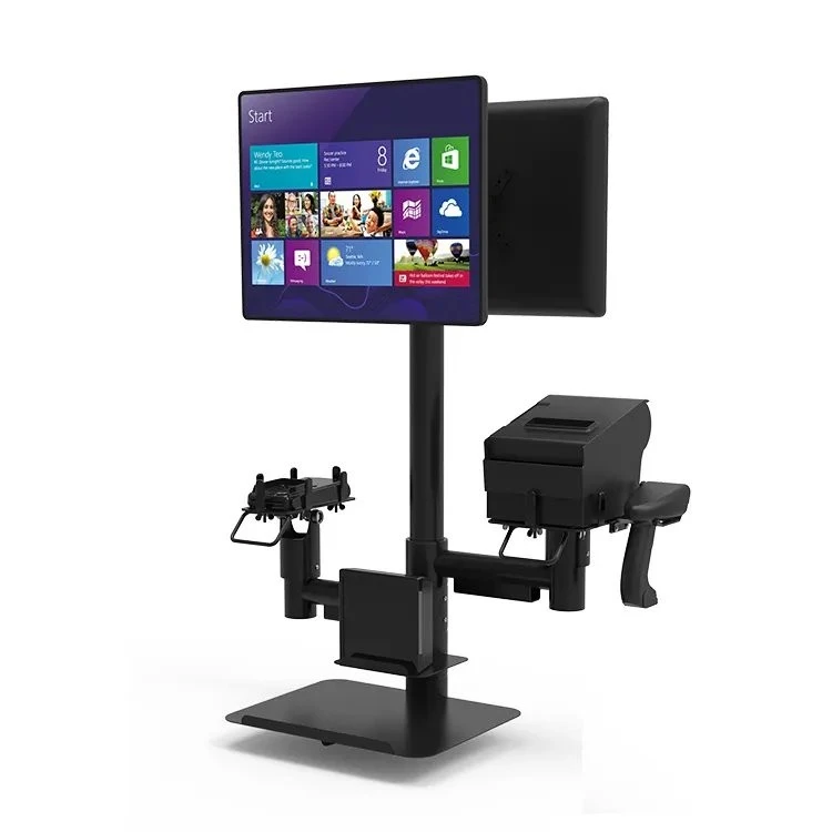 With swivel, tilt, and height adjustment, operators can easily position each device for optimal viewing and operation. The vertical layout reduces countertop clutter, improving workflow efficiency at checkout counters.