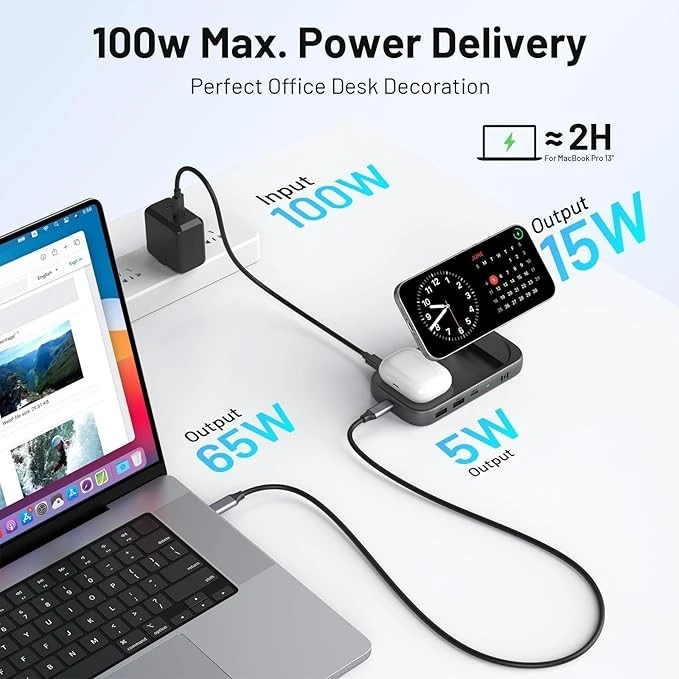 Esse 8 em 1 Magnetic Wireless Charging Docking Station Hub foi projetado para profissionais que precisam expansão maciça e integração perfeita entre laptop e smartphone.