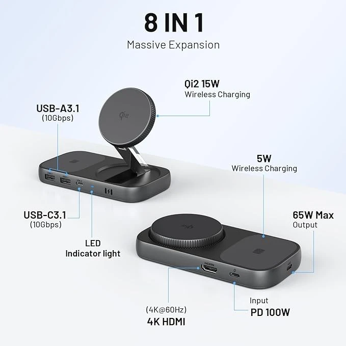 O cubo de acoplamento de carregamento sem fio de 8 em 1 em 1 combina a transferência de carregamento, transferência de dados e tela em um design dobrável. Com carregamento sem fio magnético rápido qi2 15w, portas USB 3.1 duplas, saída 4K HDMI e entrada de 100w PD, é a melhor estação de acoplamento para usuários de MacBook e iPhone. Perfeito para negócios, escritório em casa e viagens.